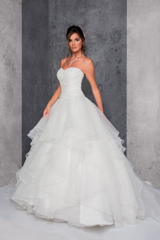 Ce modèle draprés en organza, bustier coeur et horné de strass sur le bustier. La jupe est composé de grands volants et une longue traine. Modèle romantique, et princesse.