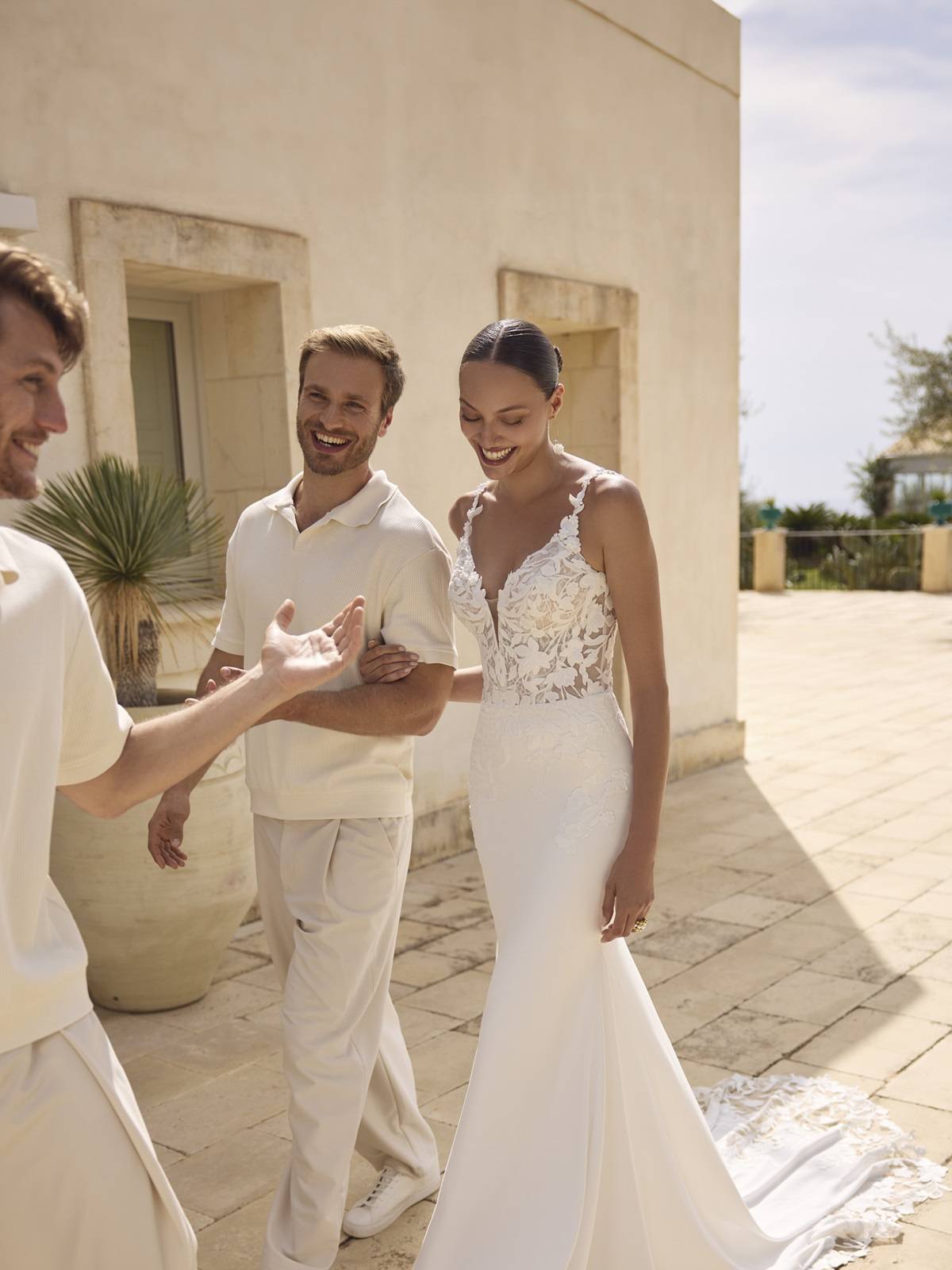 Les fines bretelles et la coupe sirène mettent en valeur les courbes avec élégance. La traîne originale, ornée d’applications de dentelle, apporte un effet spectaculaire à chaque mouvement, rendant cette robe unique et mémorable. Les mariées qui recherchent un style épuré, moderne et audacieux trouveront ici leur coup de cœur.