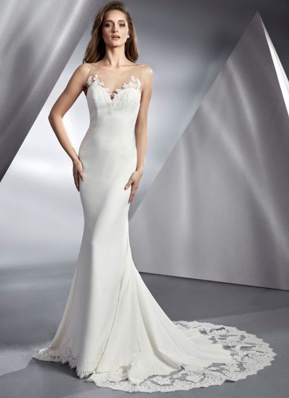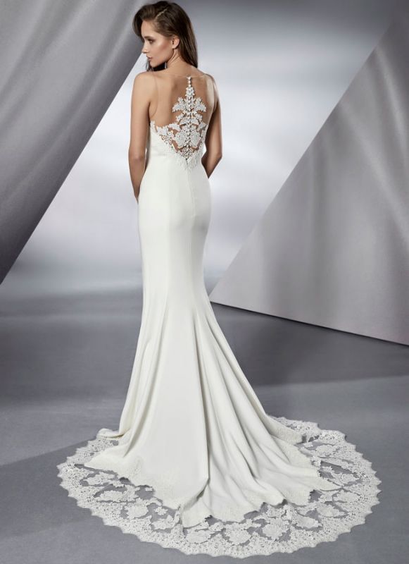 Cette robe en crèpe souligne la silhouette, son dos en dentelle très glamour et sa traine ourlée de dentelle en font un modèle très couture !!