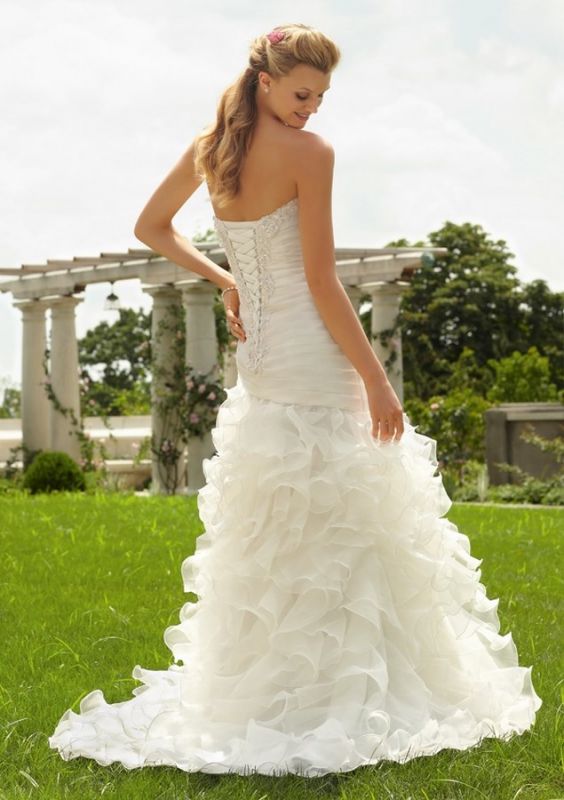 Sa longue traine et son laçage réhaussent le dos tandis que les jambes seront mises en valeur